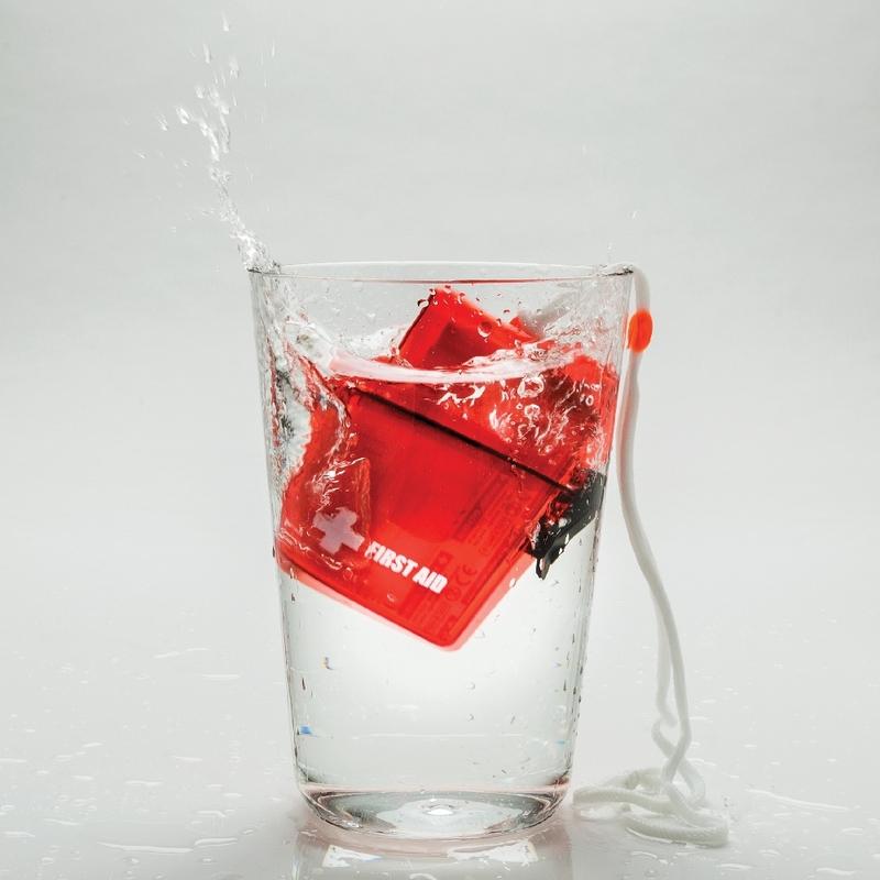 Apteczka zapakowana w wodoodporne plastikowe pudełko, wewnątrz: 5 szt. pasków samoprzylepnych, gąbka non woven, 2 płatki dezynfekujące alkoholowe, 2 nawilżające chusteczki.