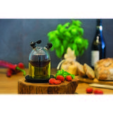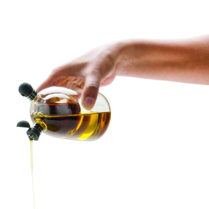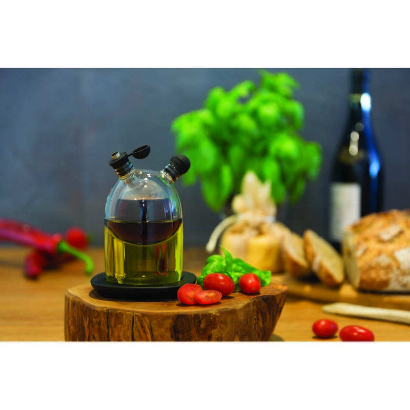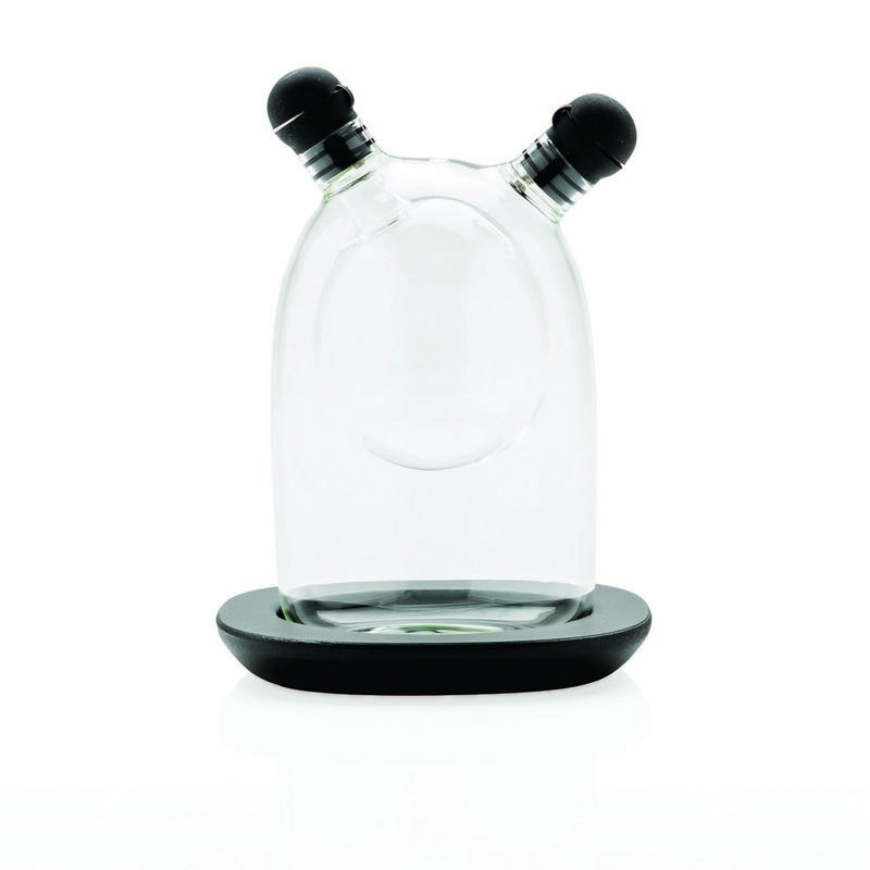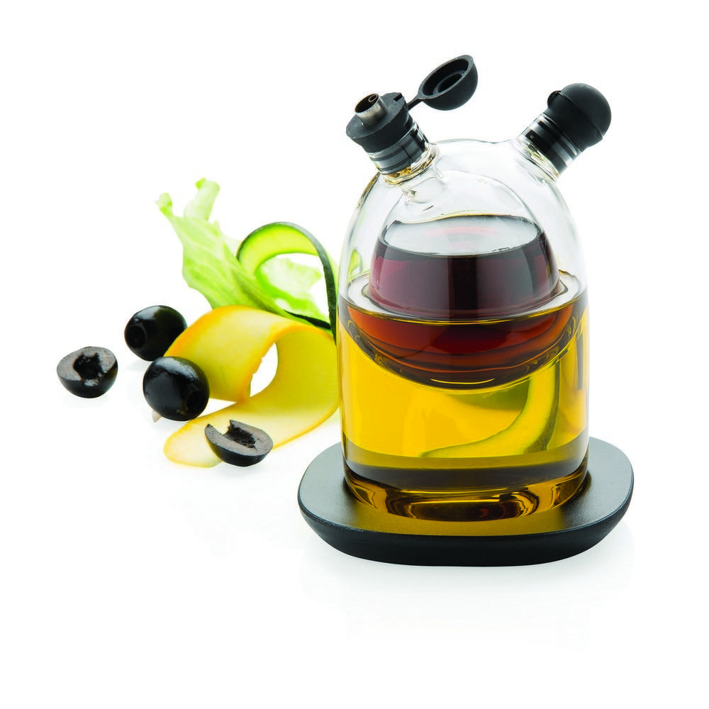Unikatowy pojemnik na oliwę i ocet z dmuchanego szkła. Posiada dwie przegrody: wewnętrzna o pojemności 60 ml oraz zewnętrzna o pojemności 140 ml. Idealne rozwiązanie do przechowywania i serwowania oliwy oraz octu z tej samej butelki. Rekomendowane mycie ręczne. Wzór zastrzeżony®