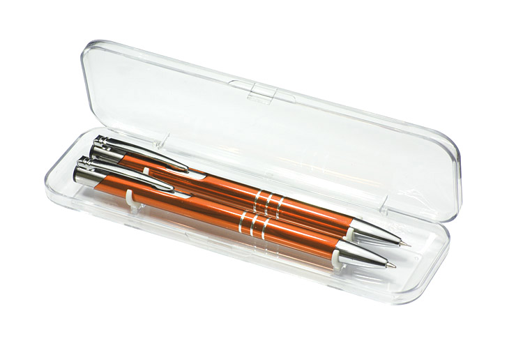 Zestaw piśmienniczy KALIPSO zawiera ołówek automatyczny oraz długopis. Artykuły piśmiennicze wykonane są z metalu o metalizowanej powierzchni, zdobione 3 ringami, pakowane w etui z przezroczystego tworzywa. Długopis z niebieskim wkładem. Logo wygrawerujemy bezpośrednio na długopisie i ołówku lub nadrukujemy na pudełku metodą tampodruku.
