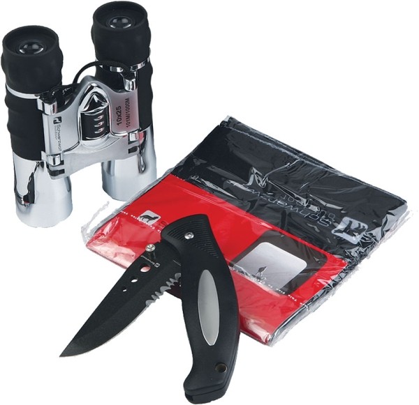 Zestaw turystyczny Schwarzwolf. Zawiera: składany nóż ze stali nierdzewnej ze sprzączką, wielofunkcyjną chustę, 10 x 25 lornetkę oraz neoprenowy pokrowiec. Zestaw turystyczny Schwarzwolf. Zawiera: składany nóż ze stali nierdzewnej ze sprzączką, wielofunkcyjną chustę, 10 x 25 lornetkę oraz neoprenowy pokrowiec.
