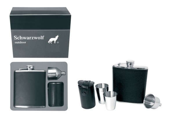Zestaw z piersiówką Schwarzwolf. Zawiera: piersiówkę pokrytą czarną skórą, 4 kieliszki, czarne etui, lejek. Materiał: stal nierdzewna. Objętość 180ml.